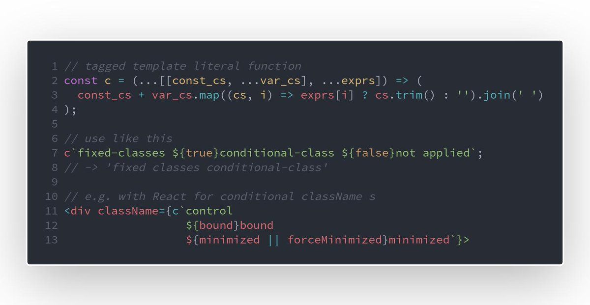 little trick for #reactjs classNames using #es6 tagged template literals: const c = (...[[const_cs, ...var_cs], ...exprs]) => ( const_cs + var_cs.map((cs, i) => exprs[i] ? cs.trim() : '').join(' ') ); c
