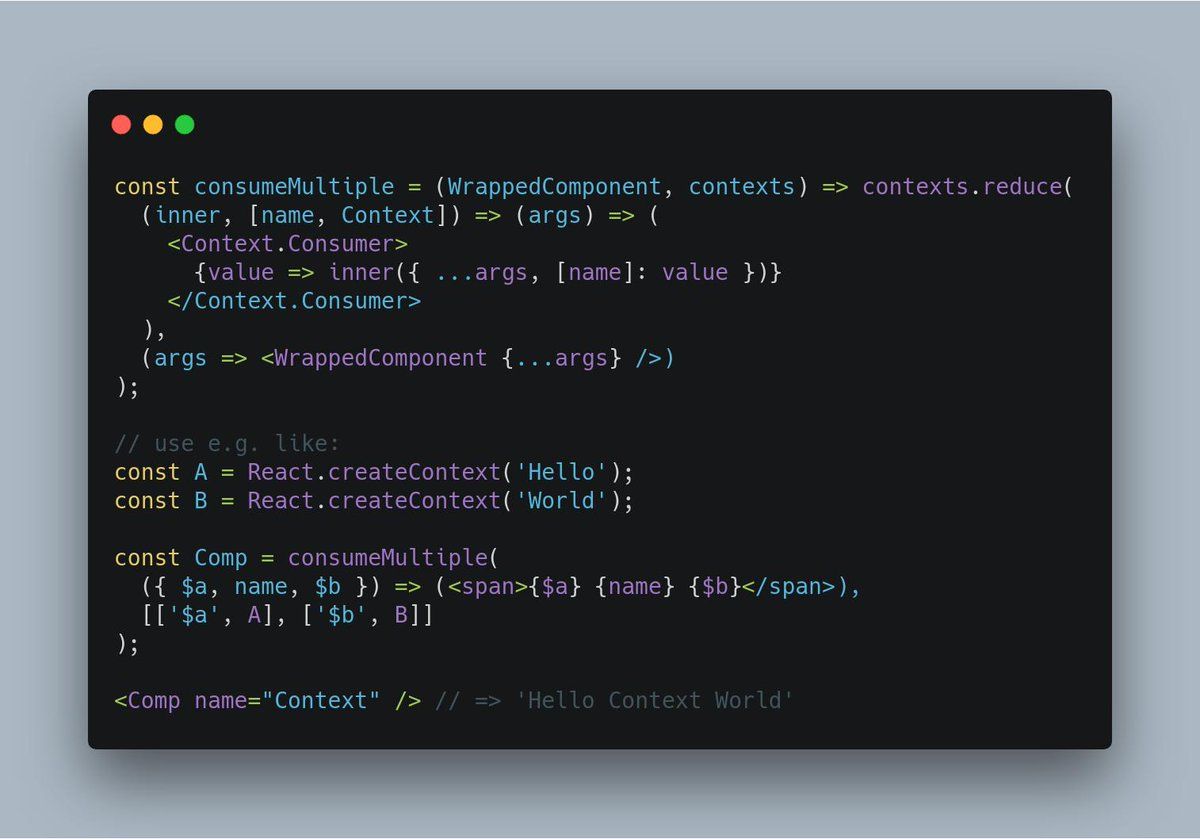 const consumeMultiple = (WrappedComponent, contexts) => contexts.reduce( (inner, [name, Context]) => (args) => ( <Context.Consumer> {value => inner({ ...args, [name]: value })} </Context.Consumer> ), (args => <WrappedComponent {...args} />) );